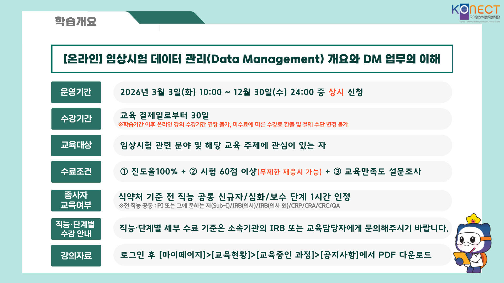[온라인] 2026년 임상시험 데이터 관리(Data Management) 개요와 DM 업무의 이해
