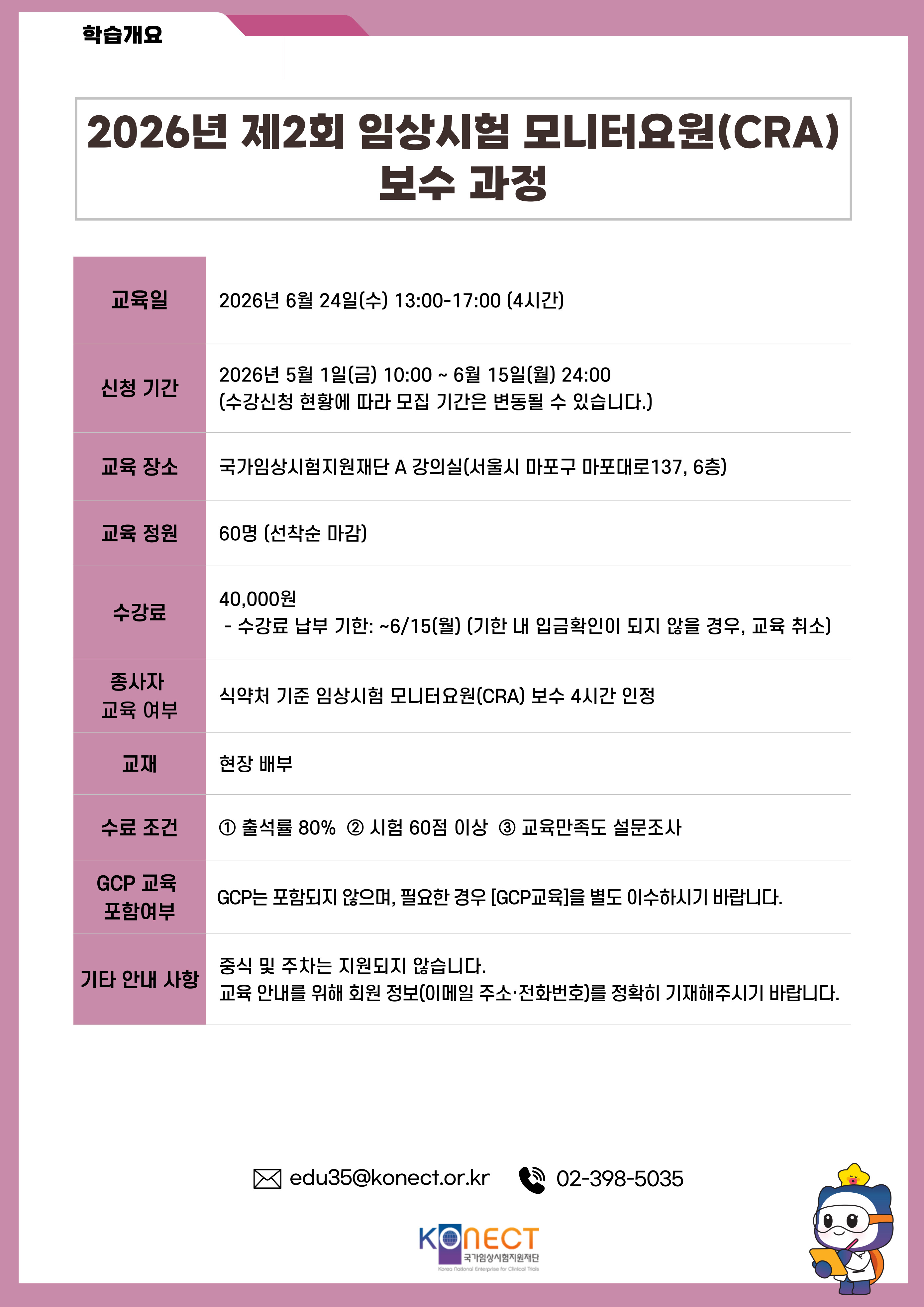 2026년 임상시험 모니터요원(CRA) 보수 과정