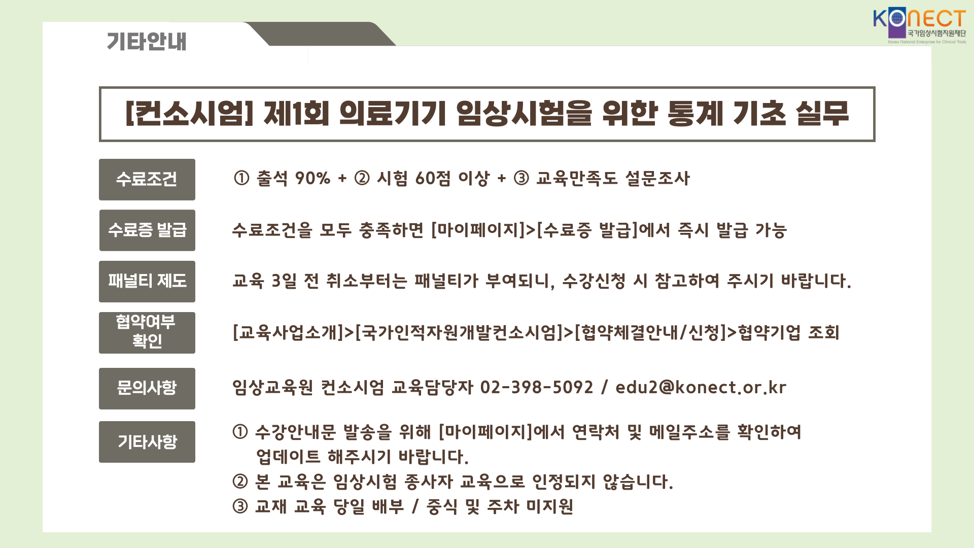 [컨소시엄] 제1회 의료기기 임상시험을 위한 통계 기초 실무_시험 |