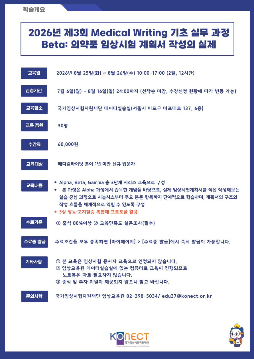 2026년 제3회 Medical Writing 기초 실무 과정 Beta: 의약품 임상시험 계획서 작성의 실제