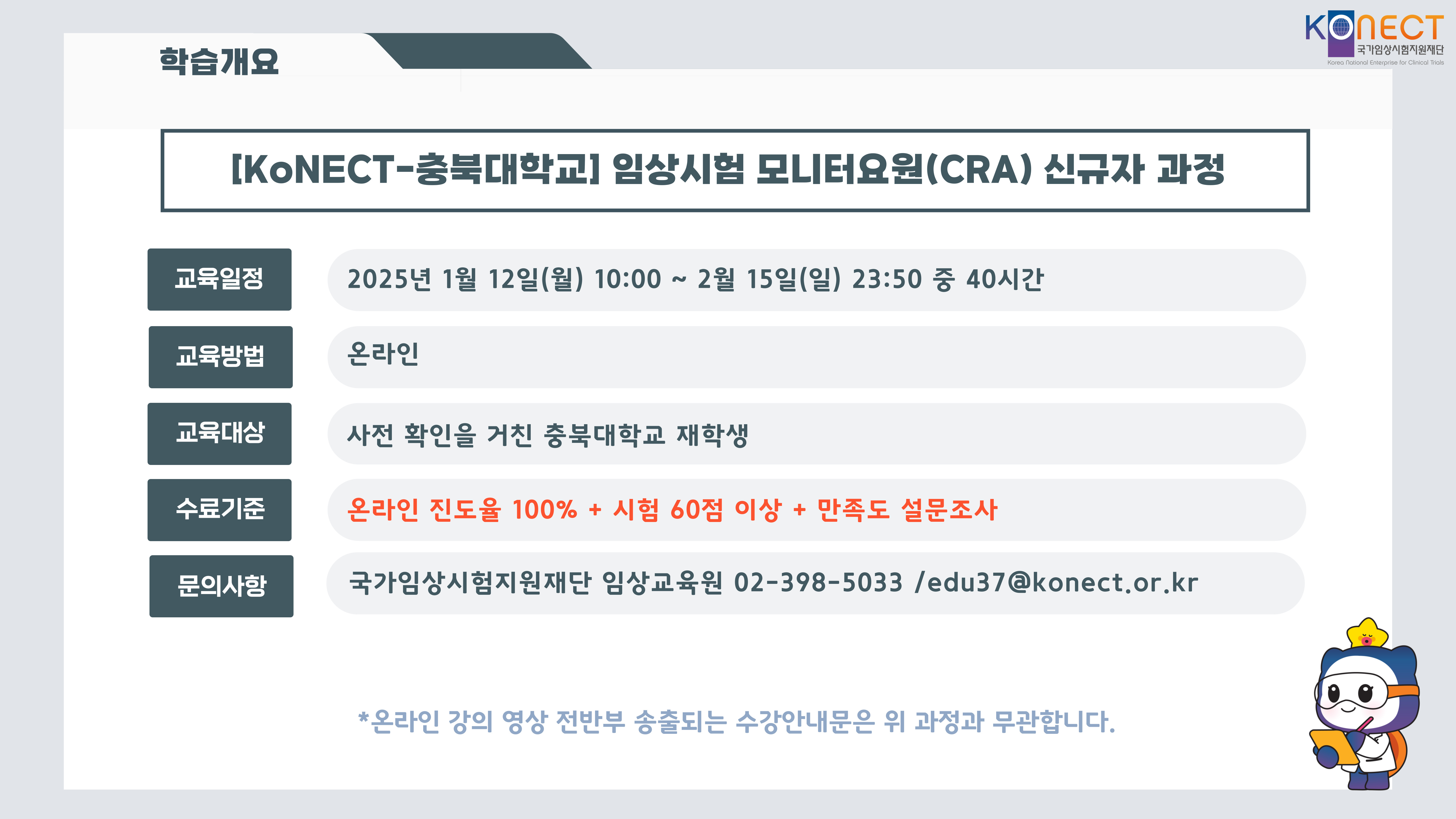 | 31 | 온라인/시험 | [KoNECT-충북대학교] 임상시험 모니터요원(CRA) 신규자 과정_시험 | ~ 2026-02-15 23:50 | 1시간 |