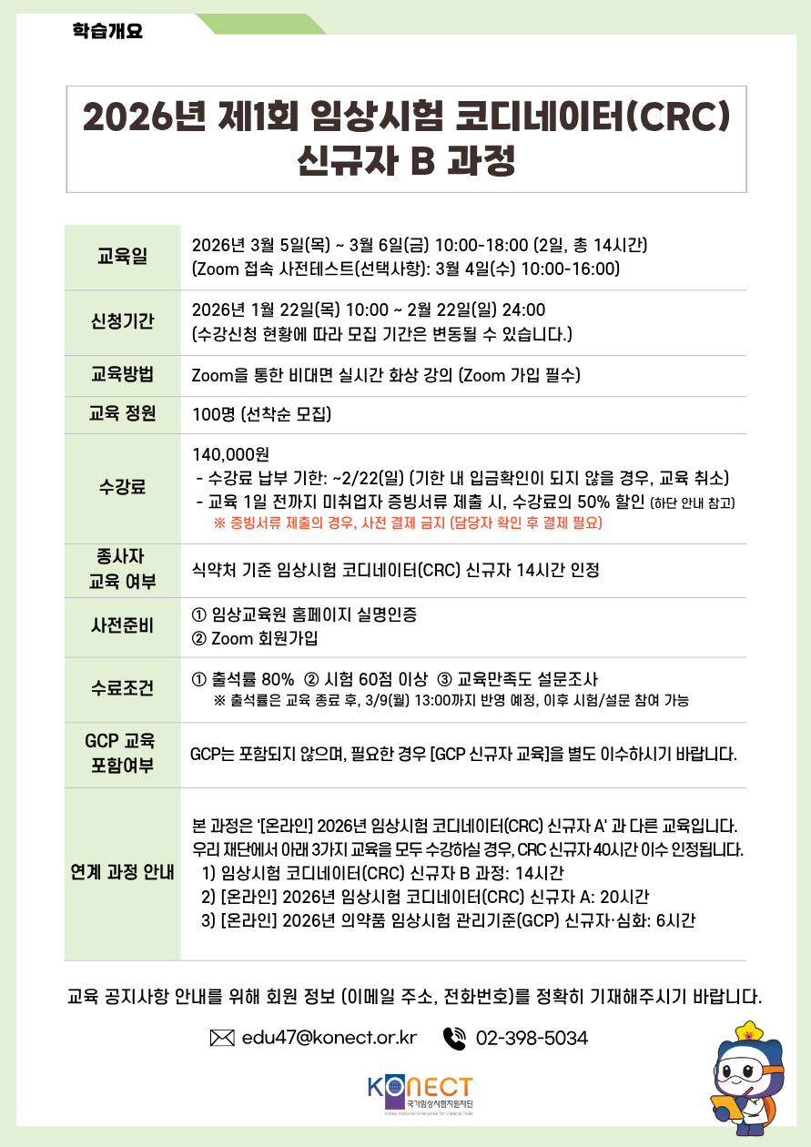 2026년 제1회 임상시험 코디네이터(CRC) 신규자 B 과정 1일차 |